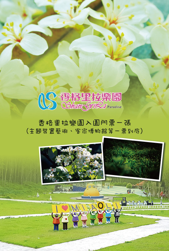 只要249元,即可享有【苗栗-香格里拉樂園】客家桐花祭.五月賞桐趣.親子樂遊香格里拉〈含香格里拉樂園入園門票一張(主題裝置藝術、客家博物館等一票到底)〉